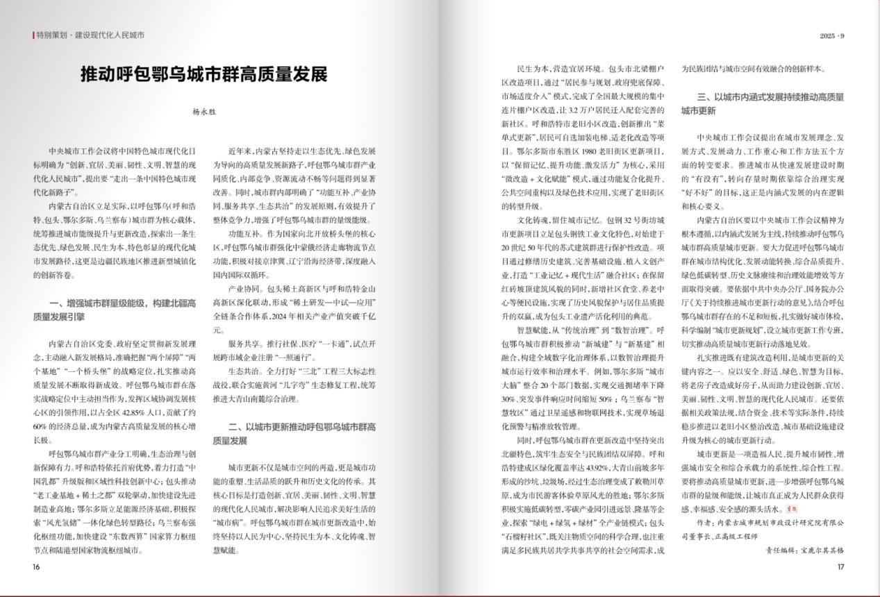 內蒙古自治區以呼包鄂烏城市群為核心載體,通過(guò)城市更新推動(dòng)高質(zhì)量發(fā)展,探索出一條生態(tài)優(yōu)先、綠色發(fā)展、民生為本、特色彰顯的現代化城市發(fā)展路徑。文章從增強城市群量級能級、推動(dòng)城市更新實(shí)踐、促進(jìn)城市內涵式發(fā)展三個(gè)方面,系統闡述了呼包鄂烏城市群在功能互補、產(chǎn)業(yè)協(xié)同、服務(wù)共享、生態(tài)共治等方面的創(chuàng )新舉措與成效,展現了其在提升城市綜合品質(zhì)、增強區域競爭力、筑牢北疆生態(tài)與民族團結屏障方面的實(shí)踐成效。