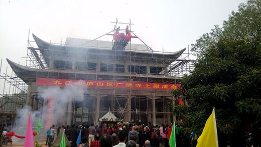 2015年10月25日上午9.30整,江西省九江市廬山區南山公園廣佛寺舉行了大雄寶殿上梁法會(huì ),四眾弟子約500人聚會(huì )于此。伴隨梵唱香贊供養,三位主法上常下福法師、上天下吉法師、上妙下心法師拈香禮佛、本寺當家上唯下正尼師、諸位師父大眾法師、現場(chǎng)居士、信眾有序環(huán)繞佛前拈香禮佛,接著(zhù)法師繞道場(chǎng)三周灑凈,龍天、護法、大德居士們法喜充滿(mǎn)。